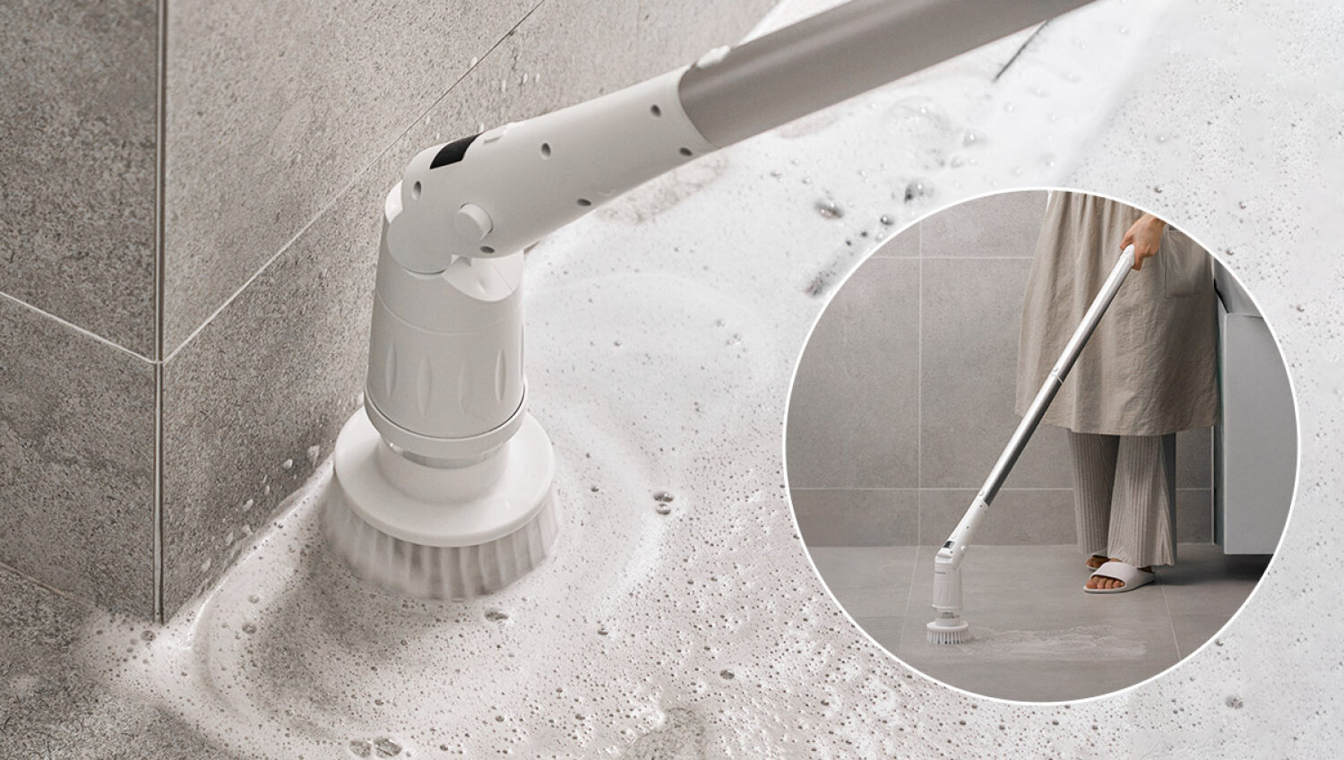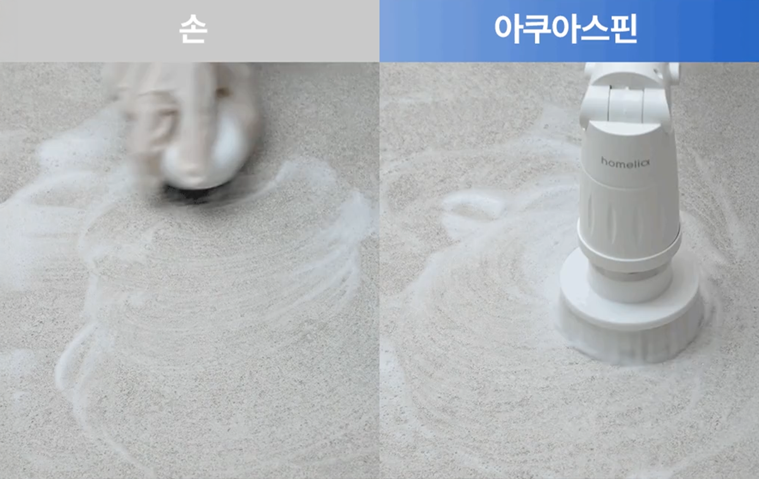손으로 청소하는 모습과 무선 욕실 청소기를 사용해 청소하는 모습을 대비하여 청소시간 70% 단축을 강조